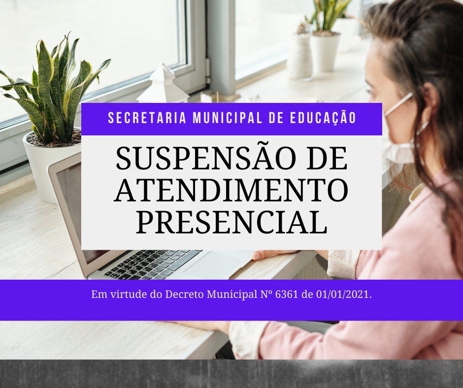 EM VIRTUDE DO DECRETO MUNICIPAL Nº 6361 DE 01/01/2021, FICA SUSPENSO TODO ATENDIMENTO PRESENCIAL ATÉ O DIA 15/01/2021.