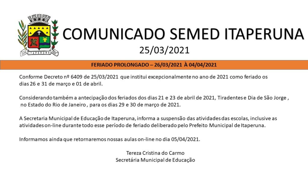 FERIADO PROLONGADO – 26/03 À 04/04/2021