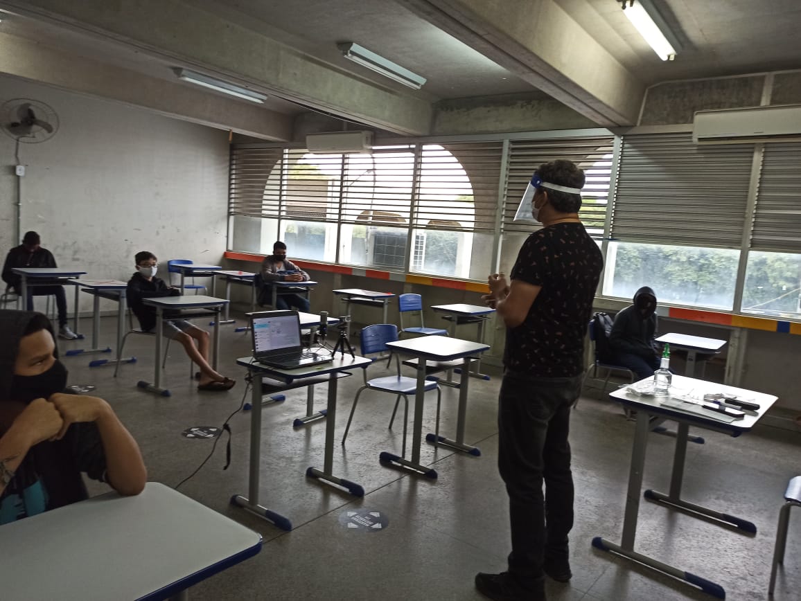 Em relação aos protocolos sanitários, todos os servidores, colaboradores e alunos presentes nos estabelecimentos de ensino deverão utilizar máscara de proteção de maneira adequada, durante todo o tempo de permanência na unidade escolar; dentre outras medidas mais, como distanciamento, uso de álcool gel, e outros.