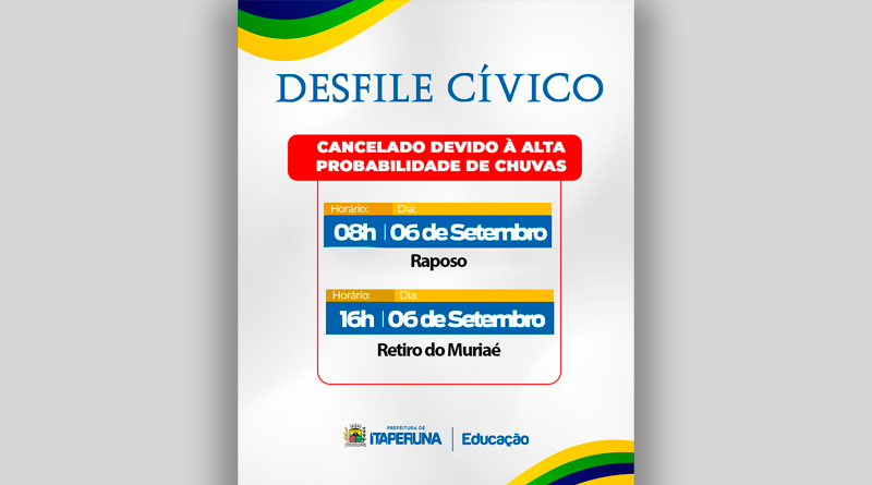 A prefeitura de Itaperuna-RJ e SEMED Comunica que os desfiles comemorativos a independência do Brasil que aconteceriam hoje (06/09/2023) nos distritos de Raposo e Retiro de Muriaé foram cancelados devido à alta probabilidade de chuva.