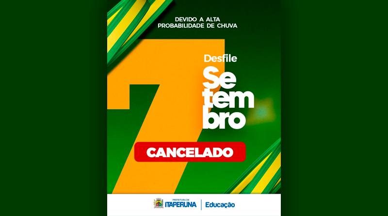 A Prefeitura Municipal de Itaperuna, por meio da Secretaria Municipal de Educação, comunica que, devido a alta probabilidade de chuva, infelizmente, será necessário CANCELAR o Desfile Cívico de 7 de setembro, que celebra a Independência do Brasil.