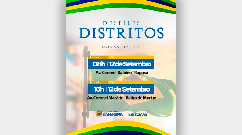Atenção para as novas datas dos desfiles nos distritos de Raposo e Retiro do Muriaé.