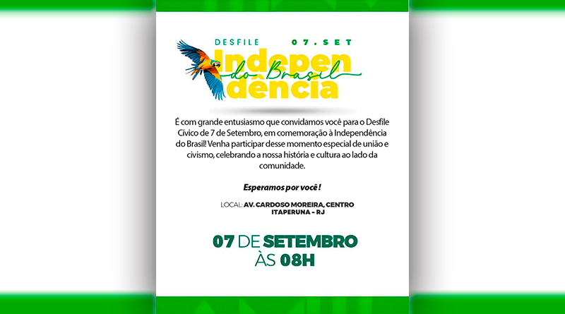 Traga sua família, convide os amigos e venha participar desse desfile cívico que é muito mais do que um evento — é uma expressão de cidadania e amor pelo nosso país. Sua presença faz toda a diferença!